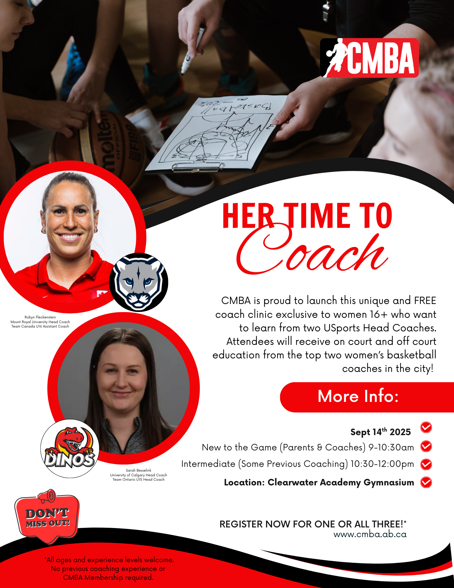 Are you ready to step onto the court with confidence and grow as a coach? CMBA is proud to launch “Her Time to Coach”, a unique and FREE coaching clinic designed exclusively for women ages 16 and up.